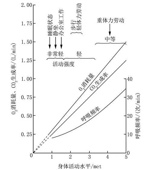 ¸ù¾ÝÏà¹ØÑо¿£¬³ÉÄêÈ˾²Ï¢×´Ì¬ÏÂÿ·ÖÖÓÔ¼ÏûºÄ0.3LÑõÆø£¬Í¬Ê±²úÉúÔ¼0.25L¶þÑõ»¯Ì¼¡£µ±1¸öÈË´¦ÓÚ·â±ÕÊÒÄÚʱ£¬ÑõÆøÅ¨¶ÈϽµÇÒ¶þÑõ»¯Ì¼Å¨¶ÈÉÏÉý£¬µ«Á½Õߵı仯ËÙÂʲ¢²»Ïàͬ¡£¼ÙÉè10m?µÄ·¿¼äÄÚÓÐ1È˾²×ø£¬ÑõÆøÅ¨¶È´Ó21%(Õý³£Öµ)Ͻµ£¬Ã¿Ð¡Ê±Ï½µÔ¼0.18%¡£¶þÑõ»¯Ì¼Å¨¶È´Ó0.04%(Õý³£Öµ)ÉÏÉý£¬Ã¿Ð¡Ê±ÉÏÉýÔ¼0.15%¡£ÔÚ5СʱÄÚ¶þÑõ»¯Ì¼Å¨¶ÈÉÏÉýÖÁ 0.79%£¬½Ó½üÓ°Ï콡¿µµÄÁÙ½çÖµ1%£¬¶øÑõÆøÈÔ±£³ÖÔÚ20%ÒÔÉÏ¡£Òò´Ë£¬¶þÑõ»¯Ì¼Å¨¶È»áÏÈÓÚÑõÆø´ïµ½Î£ÏÕÁÙ½çÖµ£¬ÊǸüÐèÒª¹Ø×¢µÄÆøÌåÖ¸±ê¡£